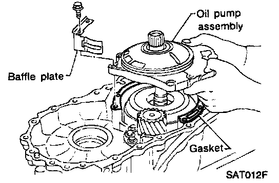 5. Install oil pump assembly, baffle plate and gasket on transmission case.