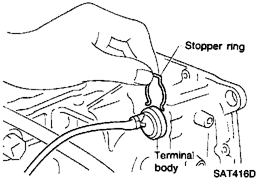 d. Pass solenoid harness through transmission case and install terminal body on transmission case by pushing it.