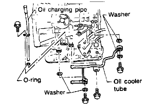 20. Install oil charging pipe and oil cooler tube to transmission case.