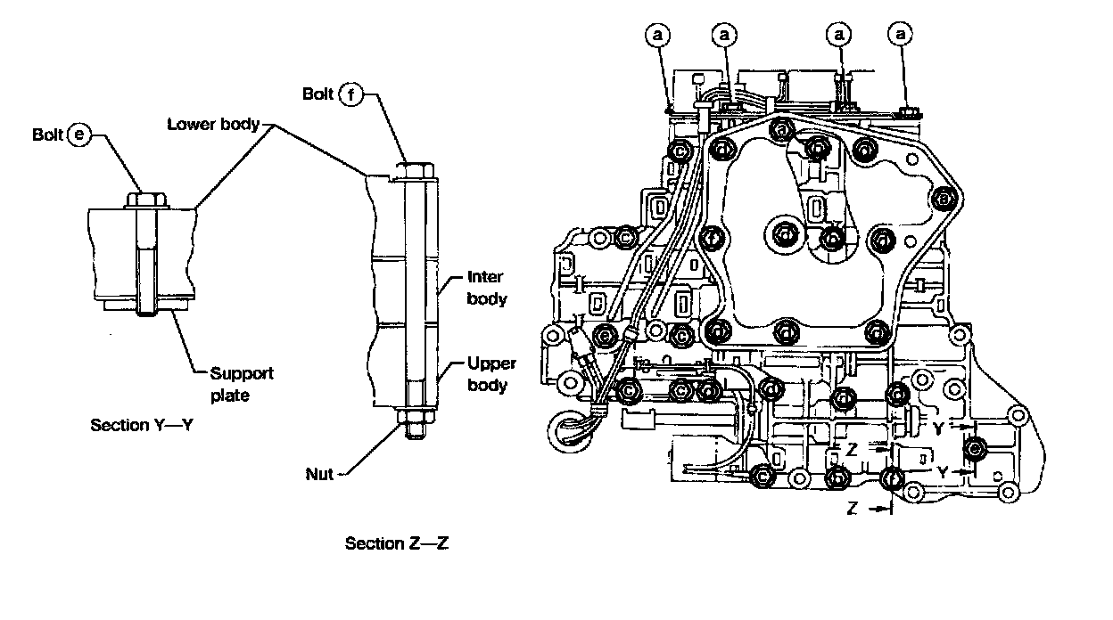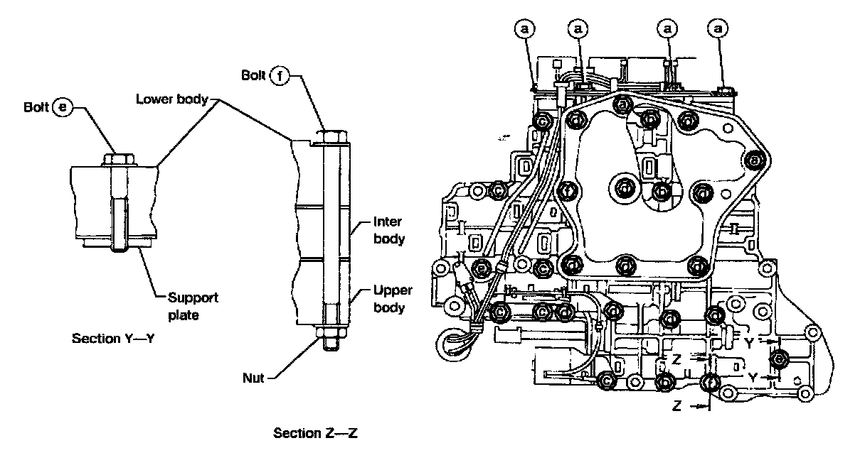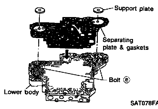 i. Install bolts (a) from bottom of lower body. Using bolts (A as guides, install separating plate and gaskets as a set.