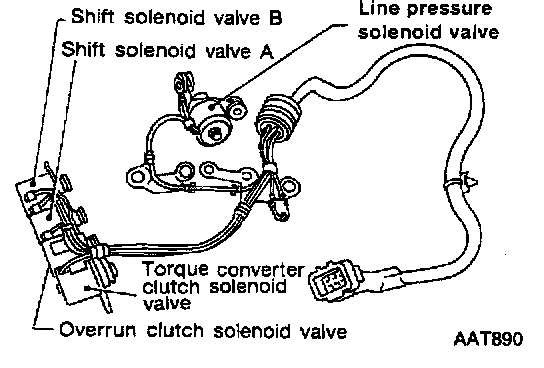 Shift solenoid valves "A" and "B", line pressure solenoid valve, torque converter clutch solenoid valve and overrun clutch solenoid valve
