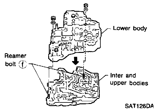 k. Install lower body on inter body using reamer bolts (f) as guides and tighten reamer bolts (f) slightly.