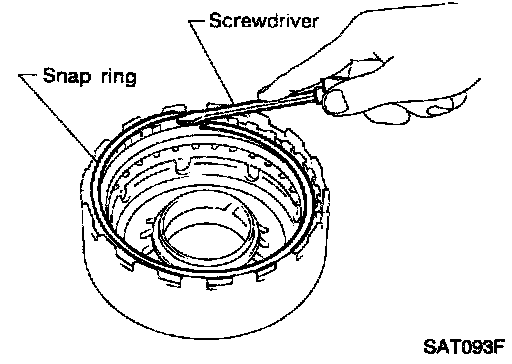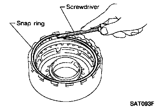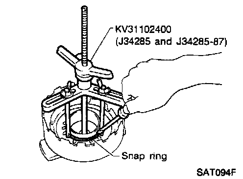 4. Set Tool on spring retainer and remove snap ring from reverse clutch drum while compressing return springs.