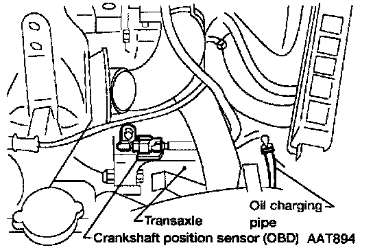 RemovalCAUTION: When removing the transaxle assembly from engine, first remove the crankshaft position sensor (OBD) from the assembly. Be careful not to damage sensor edge.