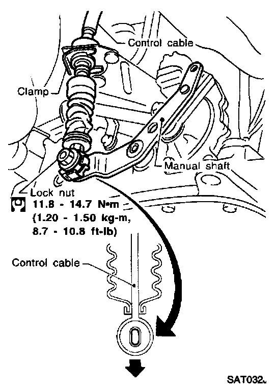 2. Loosen control cable lock nut and place manual shaft in "P" position.