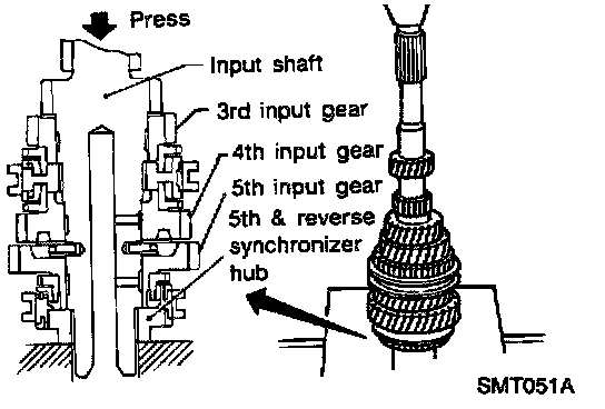 f. Press on 5th & reverse synchronizer assembly with 5th input gear.