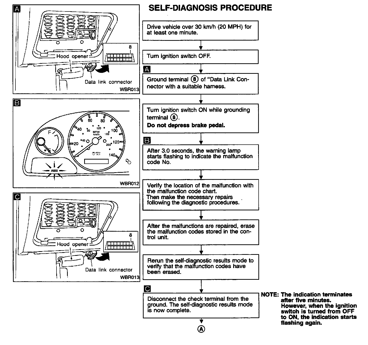 FUNCTION- When a problem occurs in the ABS, the warning lamp on the instrument panel comes on. To start the self-diagnostic results mode, ground the self-diagnostic (check) terminal located on the "Data Link Connector. The location of the malfunction is indicated by the warning lamp flashing on the instrument panel.