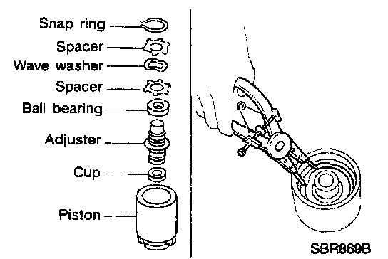 2. Remove snap ring from piston with suitable pliers and remove adjusting nut.