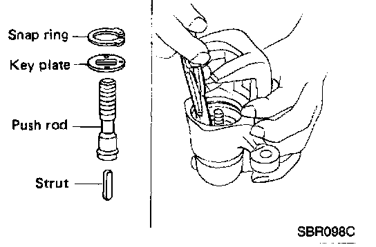 b. Remove snap ring, then remove key plate, push rod and strut.