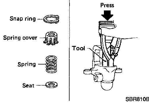 5. Install seat, spring, spring cover and snap ring while depressing with a suitable tool.