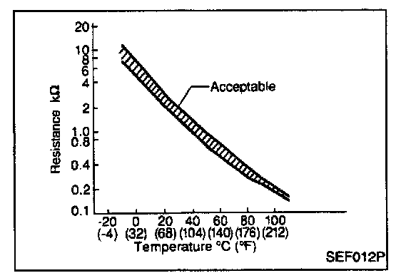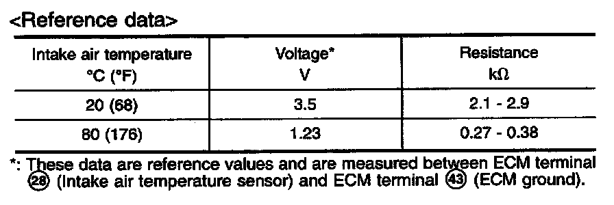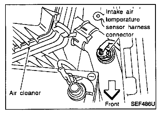 The intake air temperature sensor is mounted to the air duct housing. The sensor detects intake air temperature and transmits a signal to the ECM.