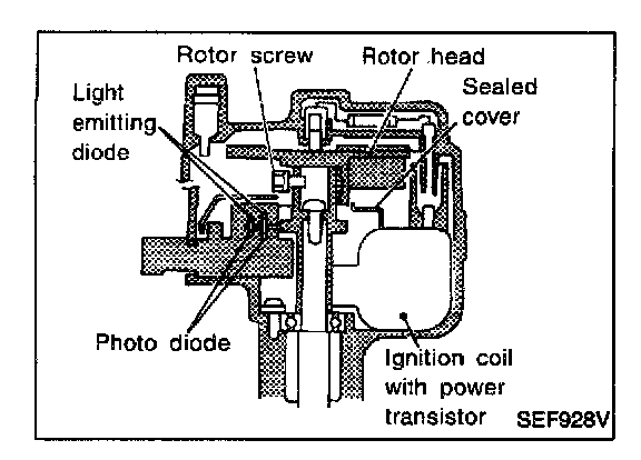 The camshaft position sensor has a rotor plate and a wave- forming circuit. The rotor plate has 360 slits for a 1° (POS) signal and 4 slits for a 180° (REF) signal. The wave-forming circuit consists of Light Emitting Diodes (LED) and photo diodes. The rotor plate is positioned between the LED and the photo diode. The LED transmits light to the photo diode. As the rotor plate turns, the slits cut the light to generate rough-shaped pulses. These pulses are converted into on-off signals by the wave-forming circuit and sent to the ECM.