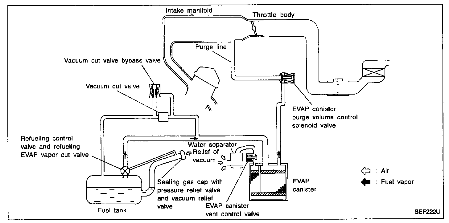 The vapor in the EVAP canister is purged by the air through the purge line to the intake manifold when the engine is operating. EVAP canister purge volume control solenoid valve is controlled by engine control module. When the engine operates, the flow rate of vapor controlled by EVAP canister purge volume control solenoid valve is proportionally regulated as the air flow increases.