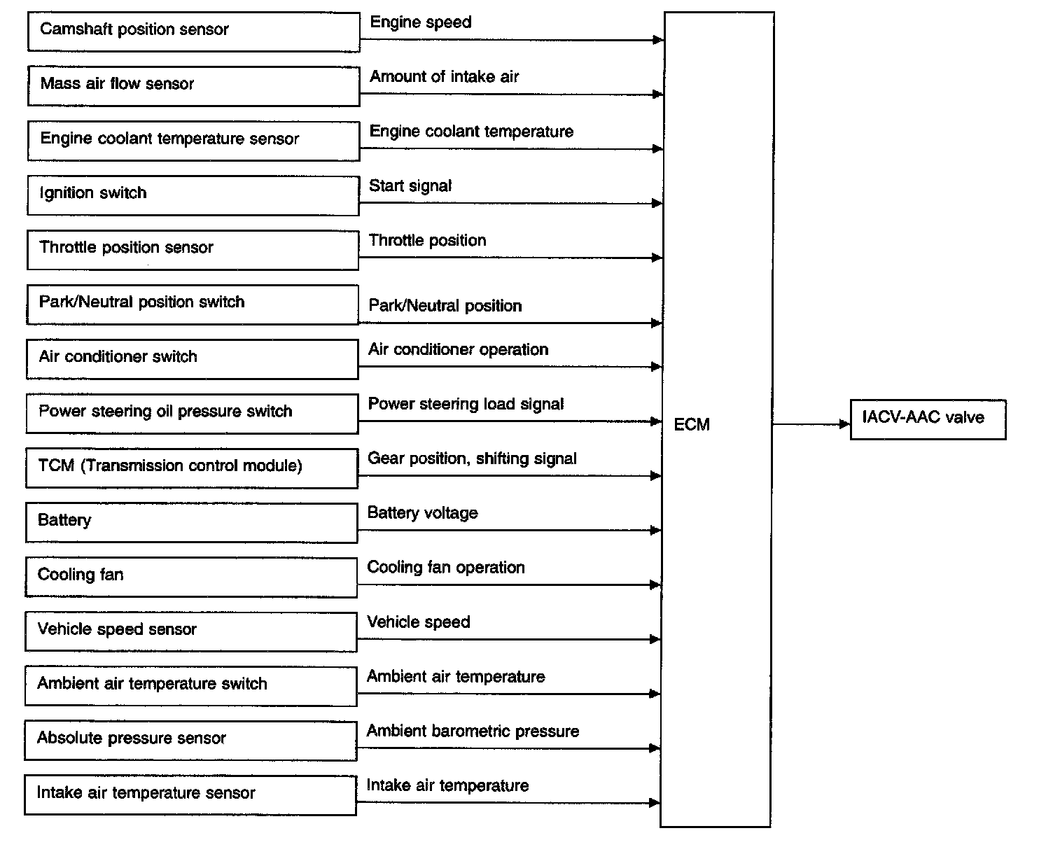 This system automatically controls engine idle speed to a specified level. Idle speed is controlled through fine adjustment of the amount of air which bypasses the throttle valve via IACV-AAC valve. The IACV- AAC valve repeats ON/OFF operation according to the signal sent from the ECM. The camshaft position sensor detects the actual engine speed and sends a signal to the ECM. The ECM then controls the ON/OFF time of the IACV-AAC valve so that engine speed coincides with the target value memorized in ECM. The target engine speed is the lowest speed at which the engine can operate steadily. The optimum value stored in the ECM is determined by taking into consideration various engine conditions, such as during warm up, deceleration, and engine load (air conditioner and power steering).