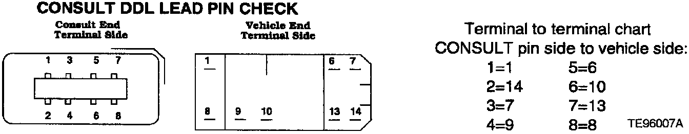 - DDL Cable Check: Does CONSULT operate, but not access the vehicle or certain menu options? Test the DDL cable by swapping the cable with a known good cable or refer to the pin testing chart shown above.