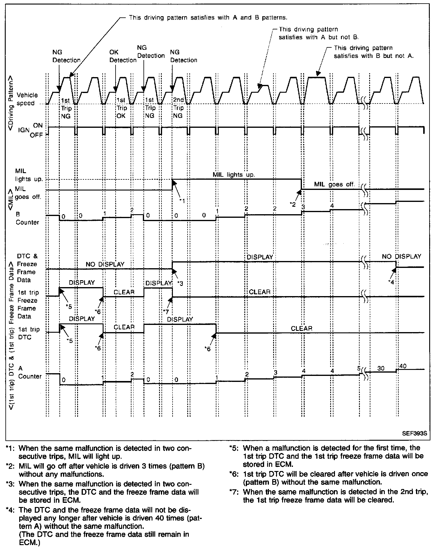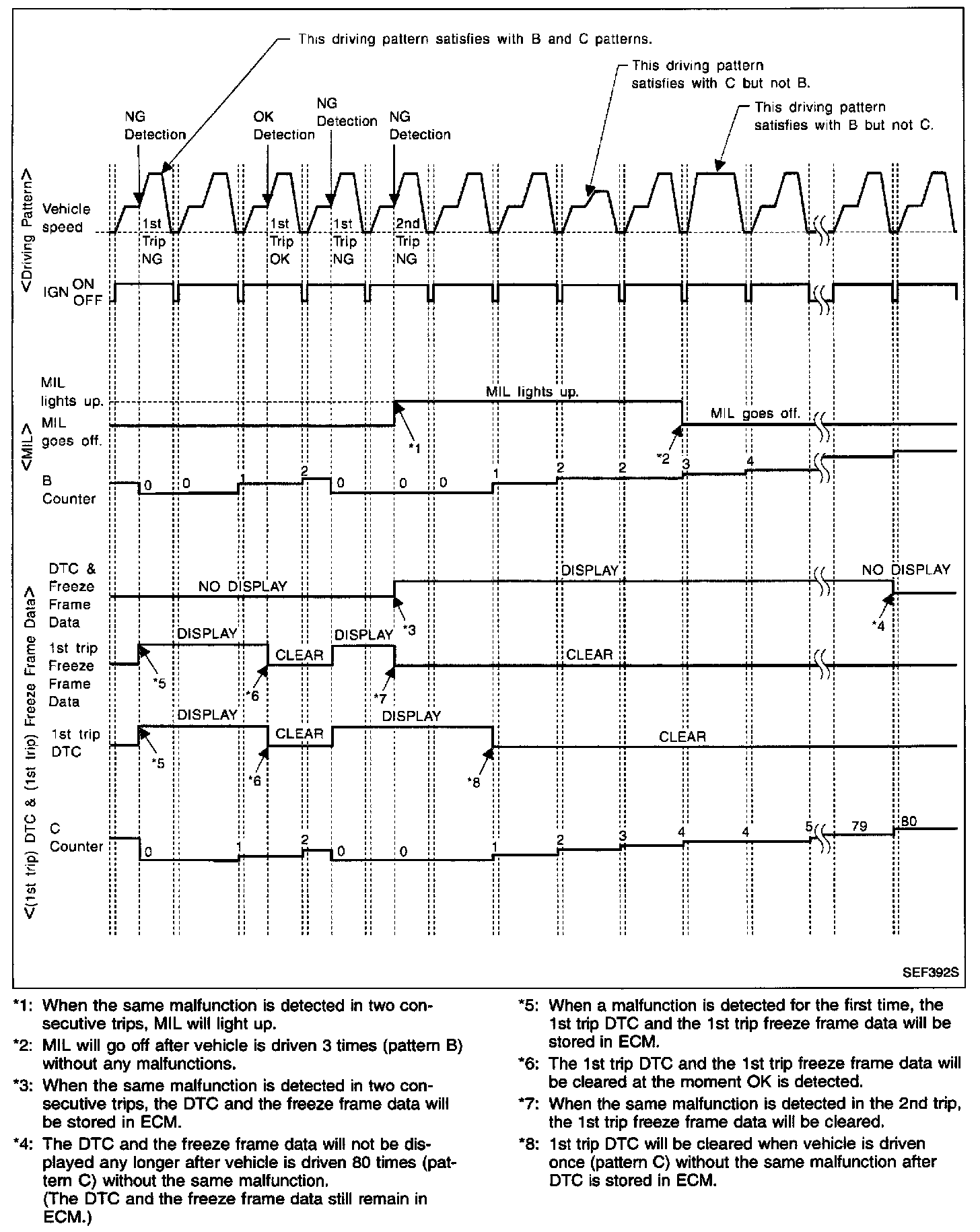 - The DTC and the freeze frame data will be stored until the vehicle is driven 40 times (driving pattern A) without the same malfunction recurring (except for Misfire and Fuel Injection System). For Misfire and Fuel Injection System, the DTC and freeze frame data will be stored until the vehicle is driven 80 times (driving pattern C) without the same malfunction recurring. The "TIME" in "SELF-DIAGNOSTIC RESULTS" mode of CONSULT-II will count the number of times the vehicle is driven.
