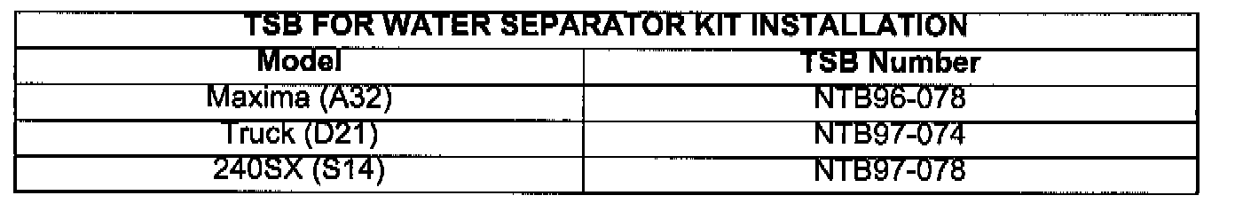 If a Maxima, Truck or 240SX is not equipped with a water separator, refer to the TSB(s) in the table above to install one.