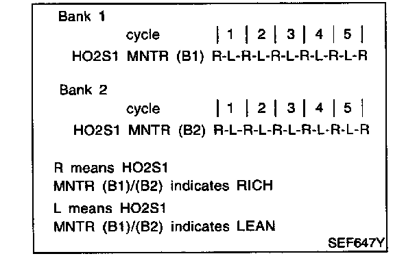 - "HO2S1 MNTR (B1 )/(B2)" in "DATA MONITOR" mode changes from "RICH" to "LEAN" to "RICH" five times in 10 seconds. 5 times (cycles) are counted as shown below:
