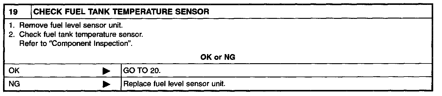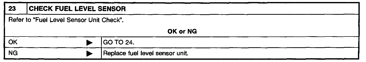 If NG, turn ignition switch "OFF" and leave the vehicle in a cool place (soak the vehicle) or refilling/draining fuel until the output voltage condition of the "FUEL LEVEL SE" meets within the range above and leave the vehicle for more than 1 hour. Then start from step 1).