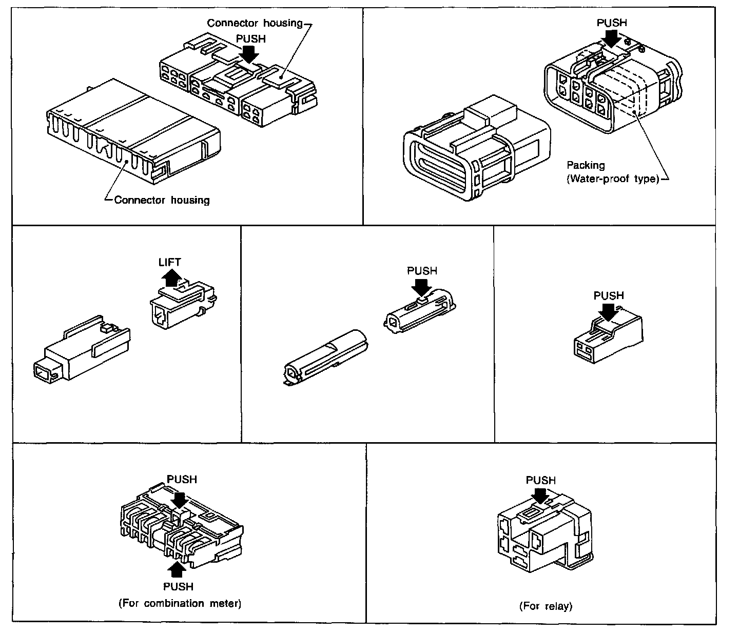 - The tab-locking type connectors are disconnected by pushing or lifting the locking tab(s). Refer to the illustration below.