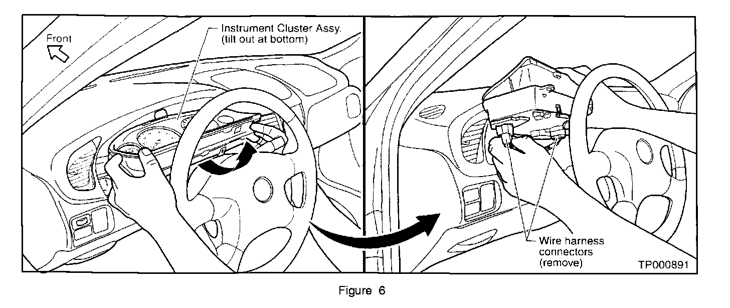 9. Re-position the instrument cluster assembly to access the wire harness connectors by tipping the bottom upward while moving towards the steering wheel and then carefully moving it to the left (see Figure 6).