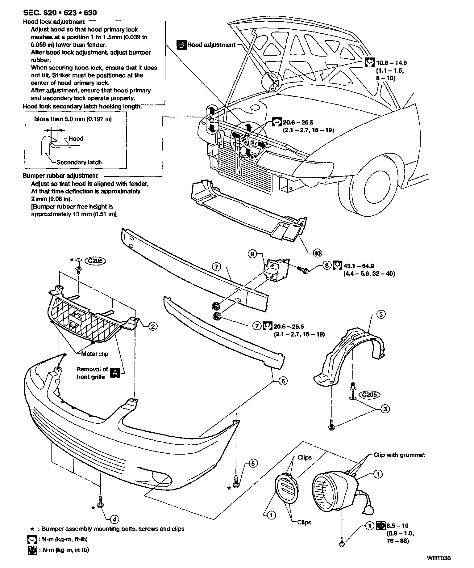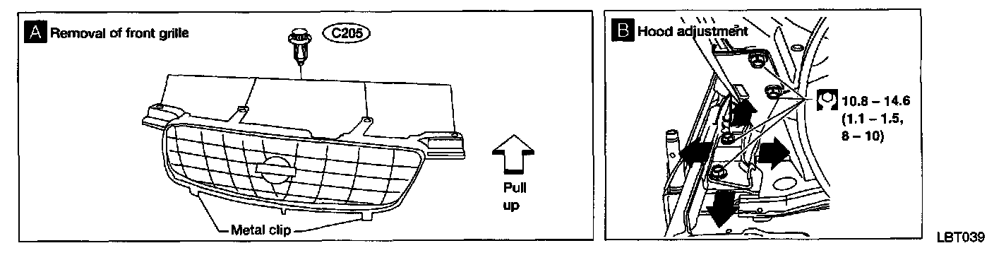 - Hood lock adjustment: After adjusting, check hood lock control operation. Apply a coat of grease to hood lock engaging mechanism.