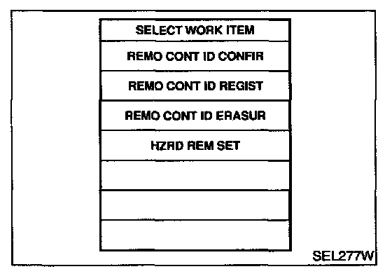 REMOTE CONTROLLER ID SET UP WITH CONSULT-IINOTE: If a remote controller is lost, the ID code of the lost remote controller must be erased to prevent unauthorized use. When the ID code of a lost remote controller is not known, all controller ID codes should be erased. After all ID codes are erased, the ID codes of all remaining and/or new remote controllers must be re-registered.