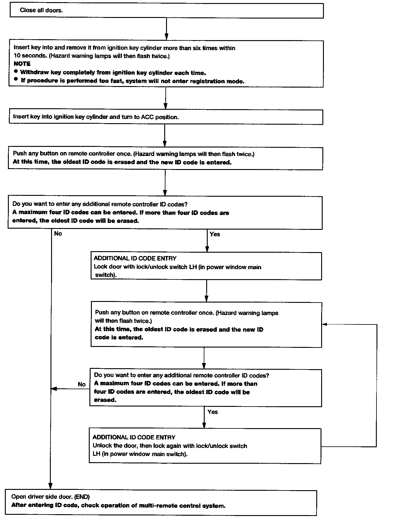- When registering an additional remote controller, the existing ID codes in memory may or may not be erased. If four ID codes are stored in memory, when an additional code is registered, only the oldest code is erased. If less than four ID codes are stored in memory, when an additional ID code is registered, the new ID code is added and no ID codes are erased.
