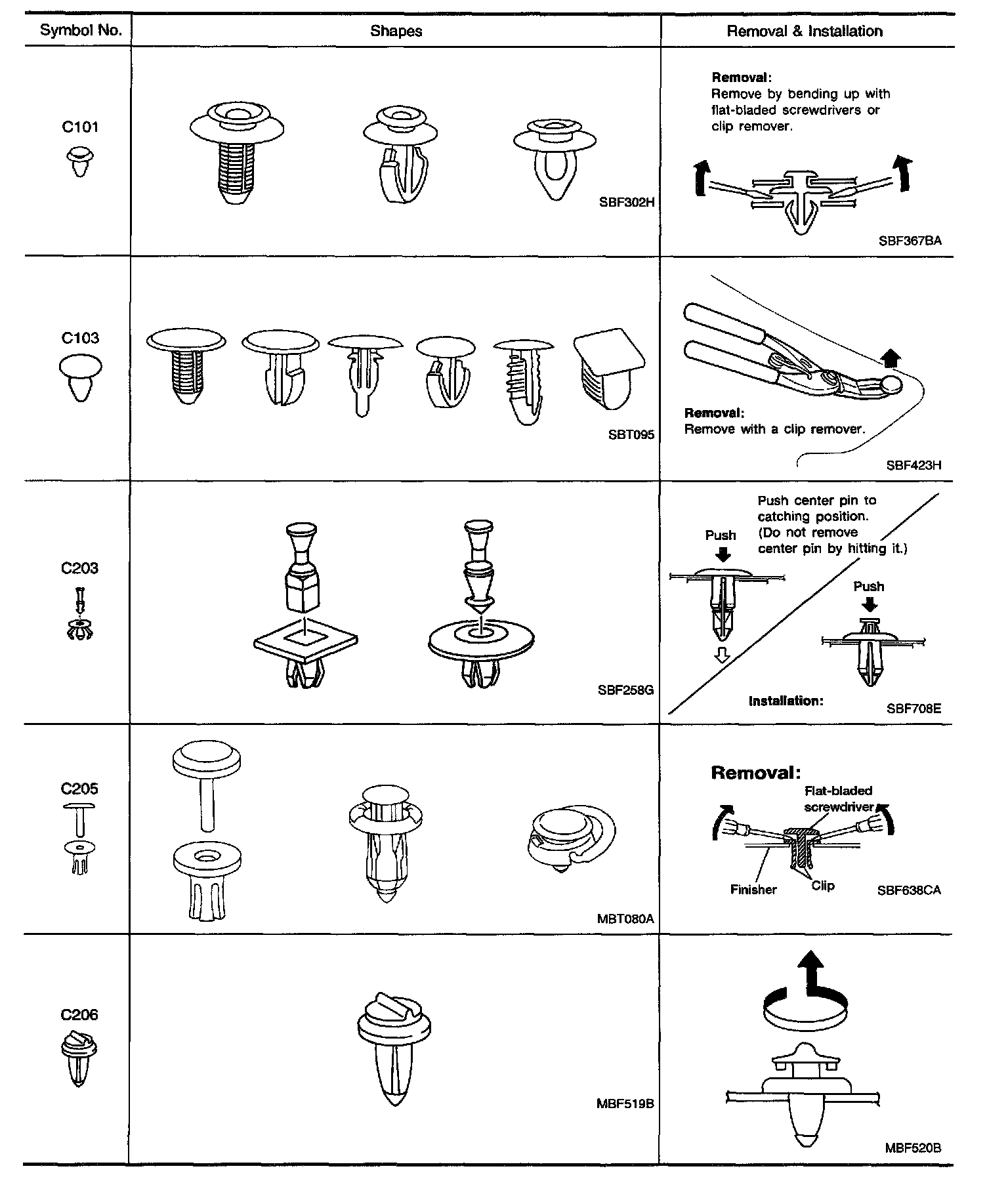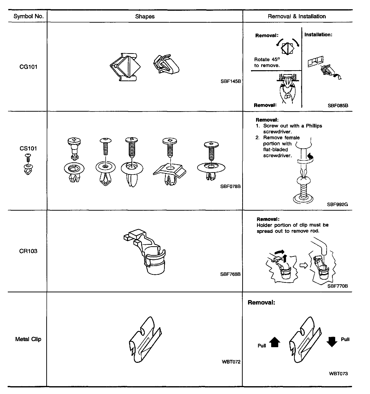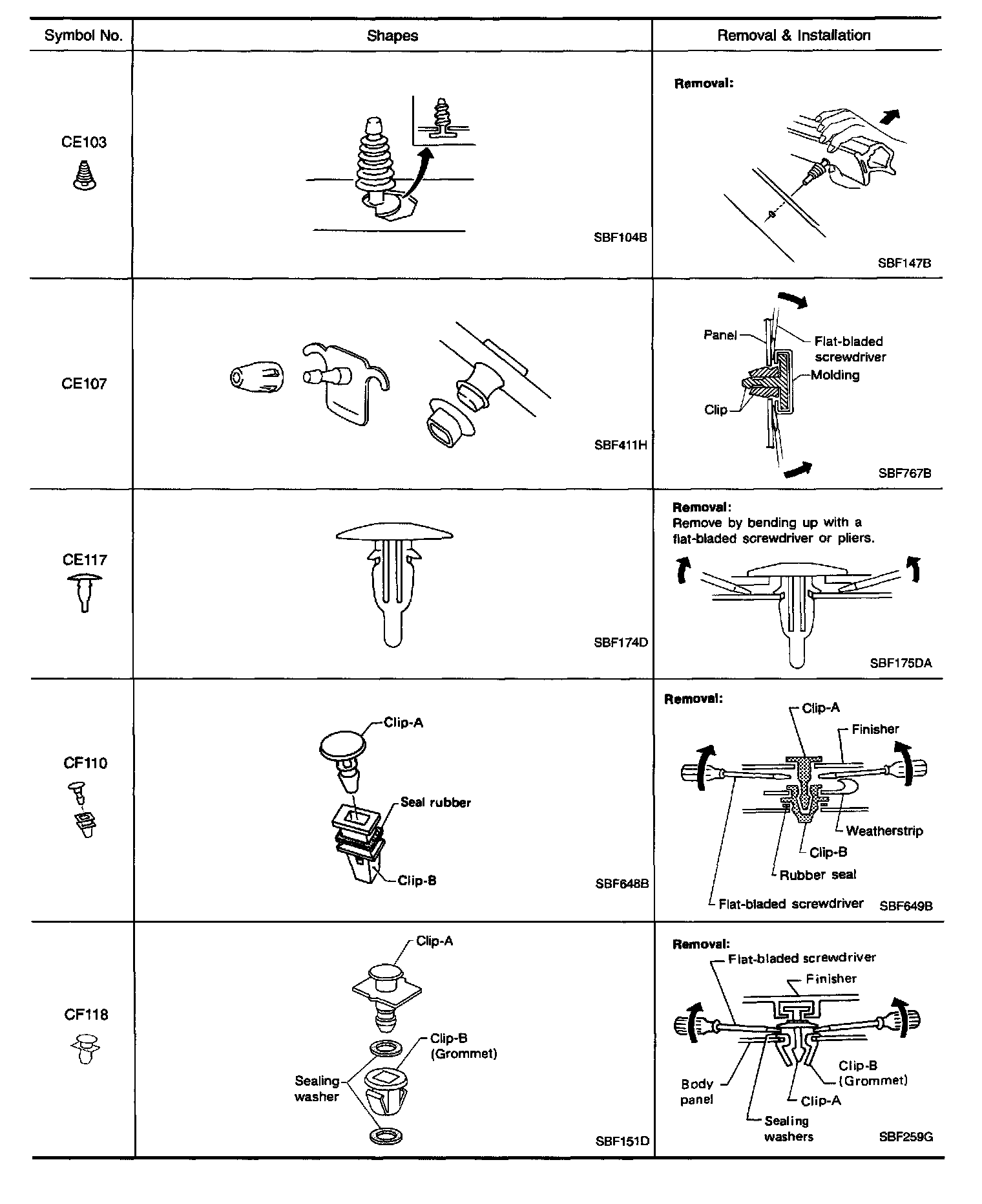 Clips and fasteners correspond to the following numbers and symbols.