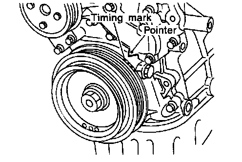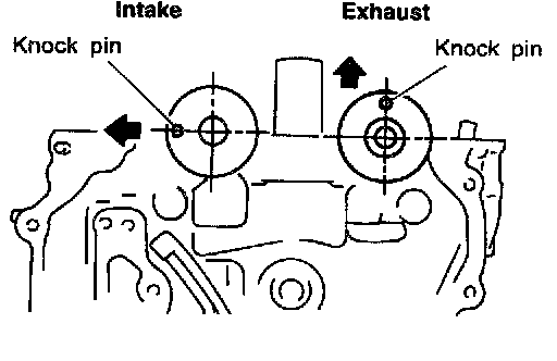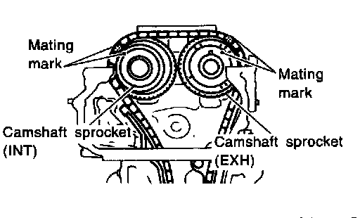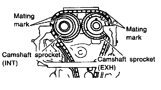 ^ Rotate crankshaft until mating mark on camshaft sprocket is set at position indicated in figure at left.