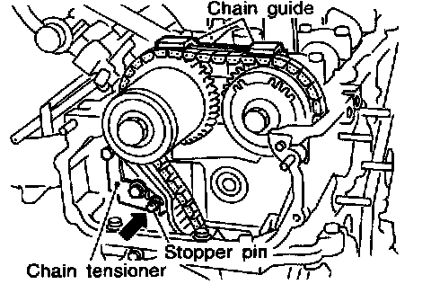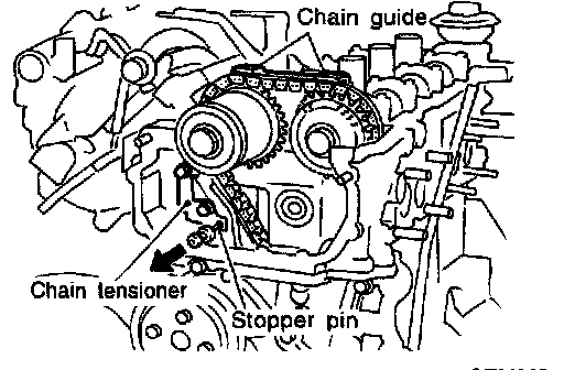^ Before installing chain tensioner, insert a suitable pin into pin hole of chain tensioner.