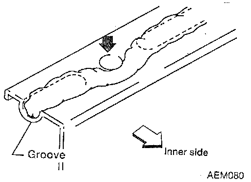 LIQUID GASKET APPLICATION PROCEDURE1. Use a scraper to remove all traces of old sealant from mating surfaces and grooves. Also, completely clean any oil from these areas.