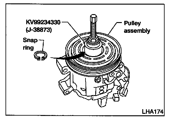 - Install the pulley assembly using the installer and a wrench, and then install the snap ring using snap ring pliers.