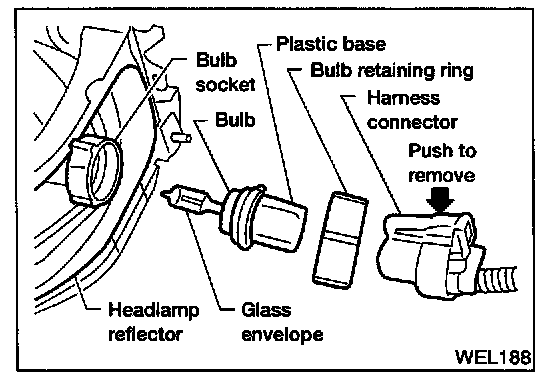 The headlamp is a semi-sealed beam type which uses a replaceable halogen bulb. The bulb can be replaced from the engine compartment side without removing the headlamp body.
