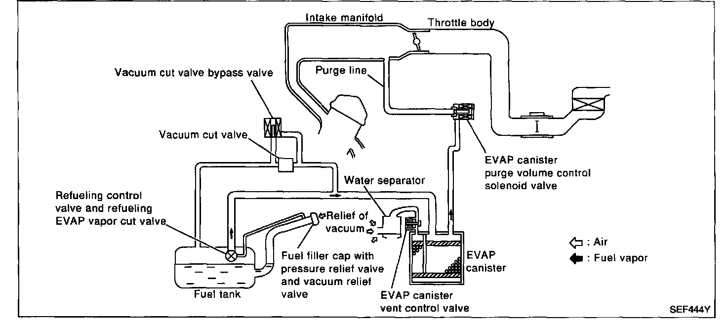 The evaporative emission system is used to reduce hydrocarbons emitted into the atmosphere from the fuel system. This reduction of hydrocarbons is accomplished by activated charcoals in the EVAP canister. The fuel vapor in the sealed fuel tank is led into the EVAP canister which contains activated carbon and the vapor is stored there when the engine is not operating or when refueling to the fuel tank.