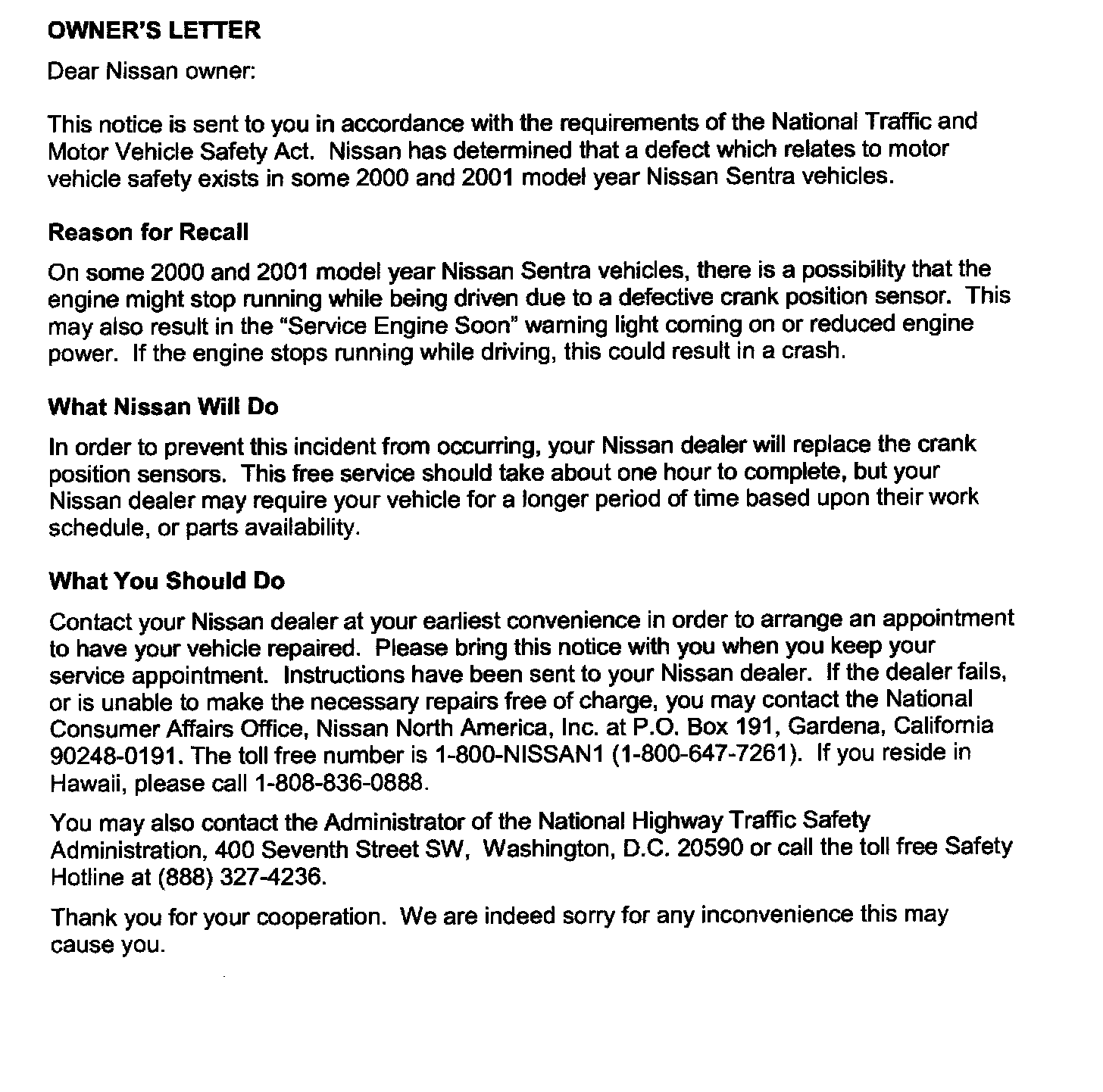 Recall - Defective Crankshaft Position Sensor