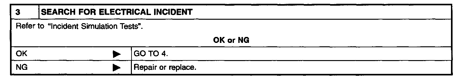 DESCRIPTIONIntermittent incidents (I/I) may occur. In many cases, the problem resolves itself (the part or circuit function returns to normal without intervention). It is important to realize that the symptoms described in the customer's complaint often do not recur on DTC (1st trip) visits. Realize also that the most frequent cause of I/I occurrences is poor electrical connections. Because of this, the conditions under which the incident occurred may not be clear. Therefore, circuit checks made as part of the standard diagnostic procedure may not indicate the specific problem area.