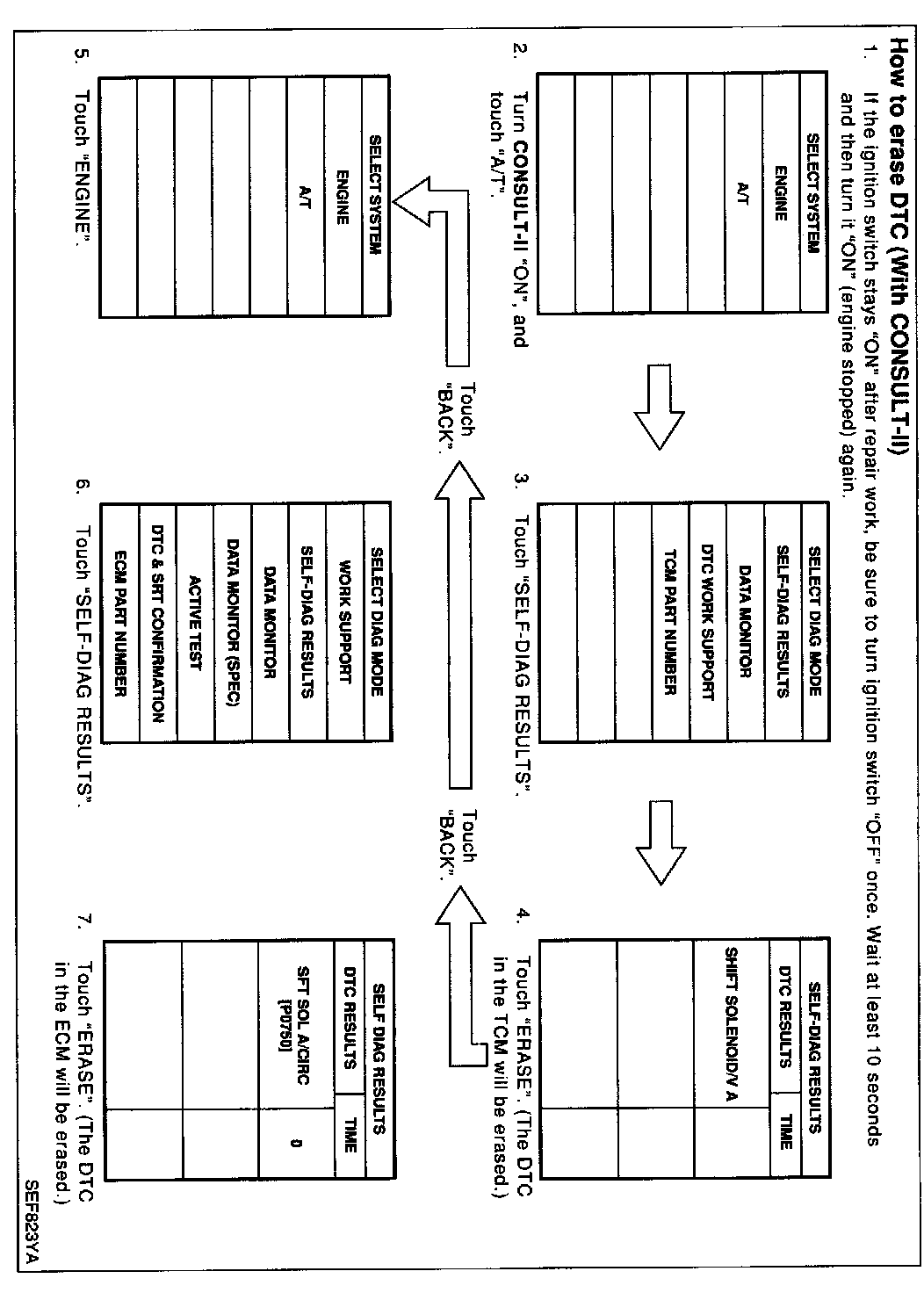 The emission related diagnostic information in the PCM can be erased by selecting "ERASE" in the "SELF-DIAG RESULTS" mode with CONSULT-II.