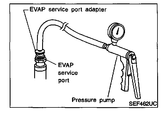 1. Attach the EVAP service port adapter securely to the EVAP service port and pressure pump with pressure gauge to the EVAP service port.
