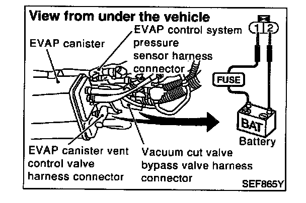 2. Apply battery voltage to between the terminals of both EVAP canister vent control valve and vacuum cut valve bypass valve to make a closed EVAP system.