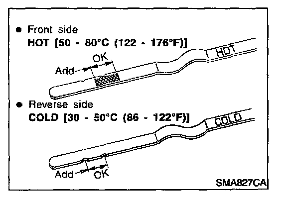 5. Re-check fluid level at fluid temperatures of 50 to 80 °C (122 to 176 °F) using "HOT" range on dipstick.
