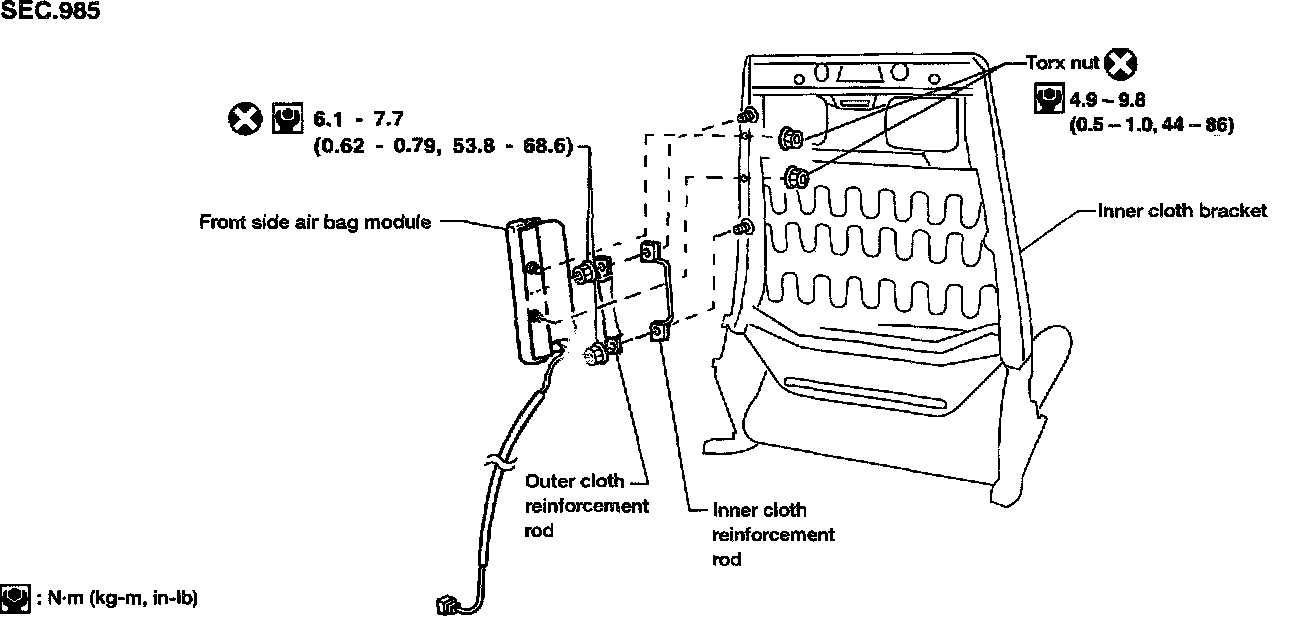1. Install front side air bag module on front seat with new Torx nuts coated with bonding agent.