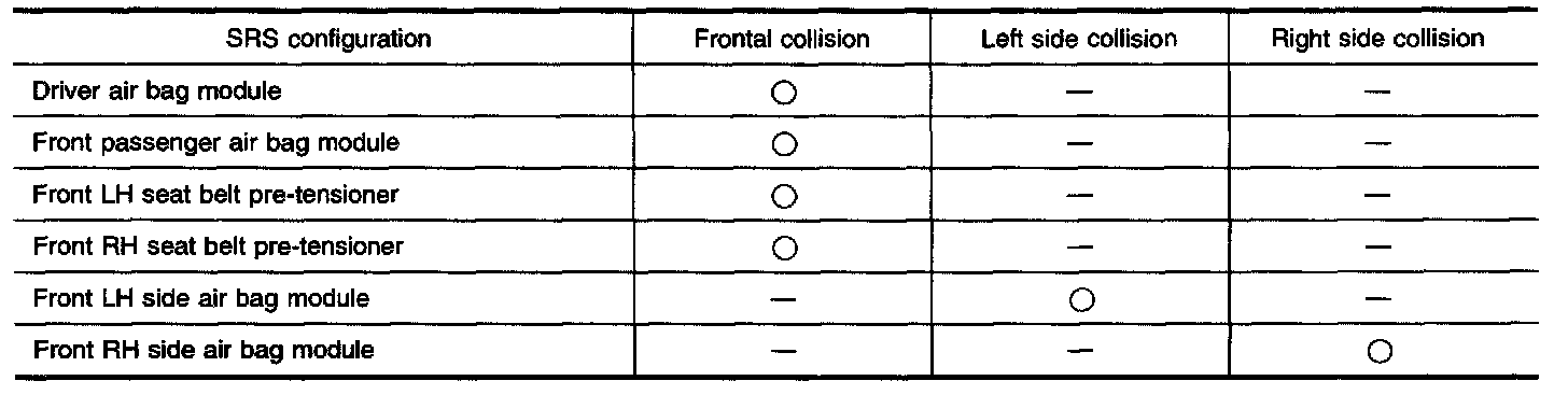 The collision modes for which supplemental restraint systems are activated are different among the SRS systems. For example, the driver air bag module and front passenger air bag module are activated in a frontal collision but not in a side collision.