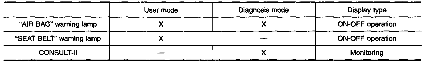 The SRS self-diagnosis results can be read by using "AIR BAG" warning lamp, "SEAT BELT" warning lamp and/or CONSULT-II. The reading of these results is accomplished using one of two modes -"User mode" and "Diagnosis mode". The User mode is exclusively prepared for the customer (driver). This mode warns the driver of a system malfunction through the operation of the "AIR BAG" warning lamp and/or "SEAT BELT" warning lamp.
