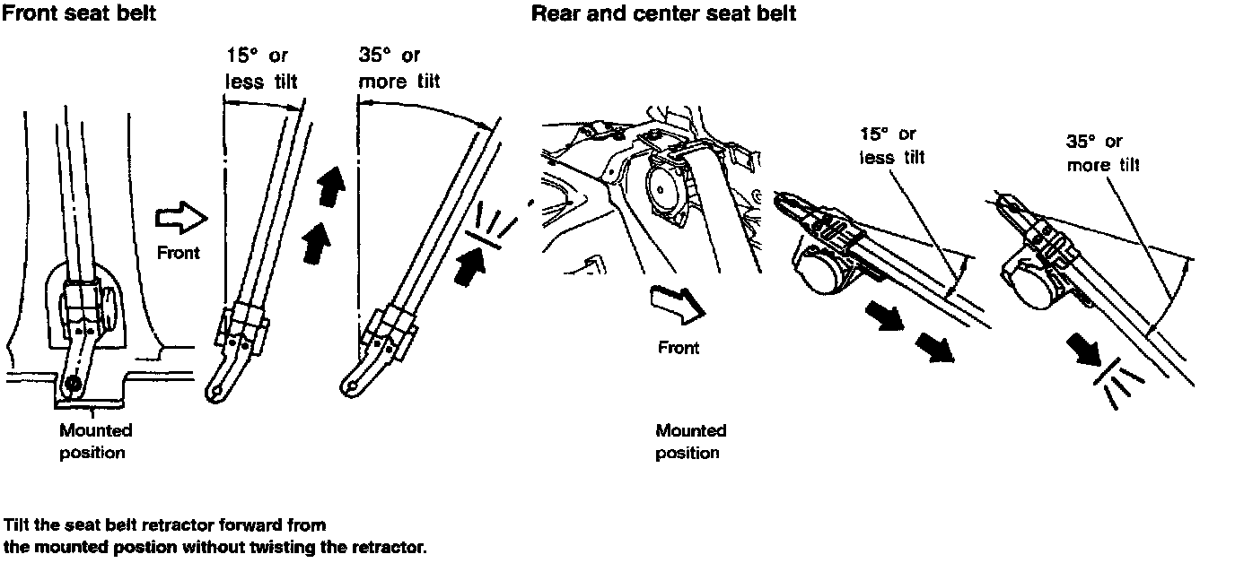 1. Remove the seat belt retractor assembly.2. Slowly pull out belt while tilting the retractor assembly forward from the mounted position without twisting the retractor assembly as shown in the illustration.