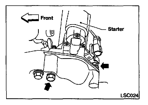 5. Remove the lower starter mounting bolt.