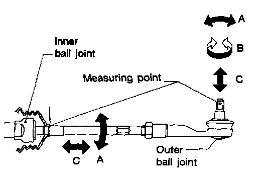 ^ Check outer and inner ball joints for swinging force "A" and axial end play "C".