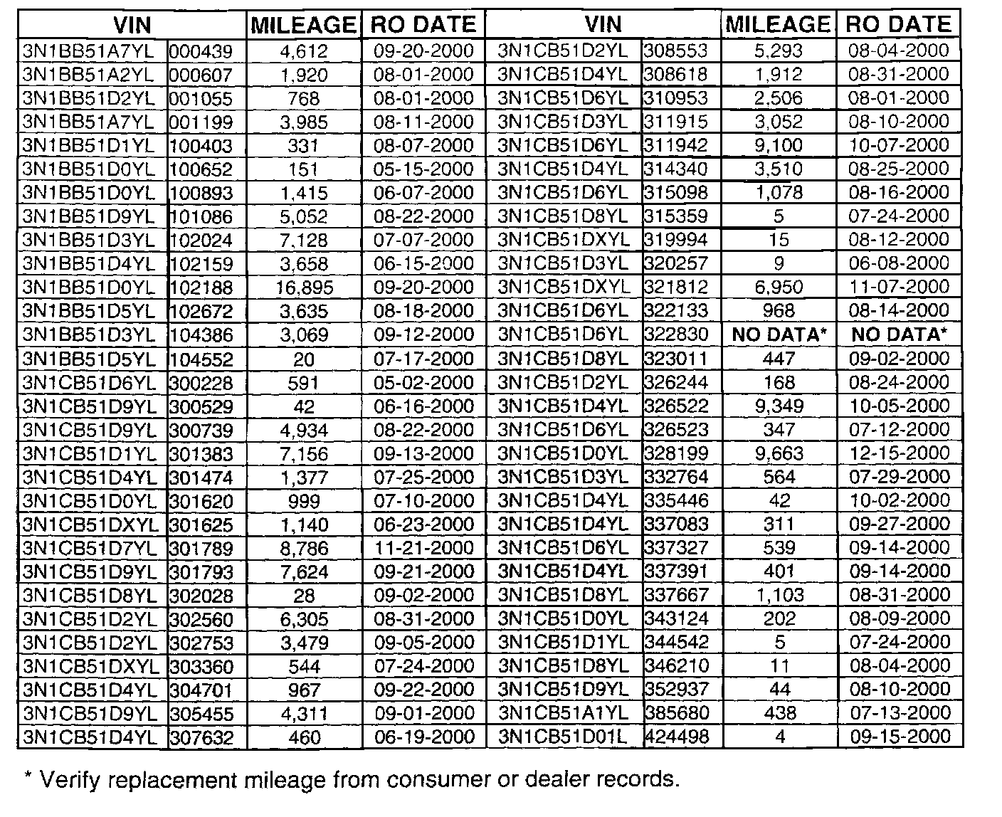 Some 2000/2001 model year Nissan Sentra vehicles contain odometers that were recently replaced and the replacement odometer may be recording the distance traveled in kilometers instead of miles. As a result, the current odometer reading on these vehicles indicates a higher number than the actual miles traveled. To correct this condition, Nissan has initiated a Voluntary Service Campaign to check each vehicle, and if necessary, replace the odometer with one showing the correct mileage.