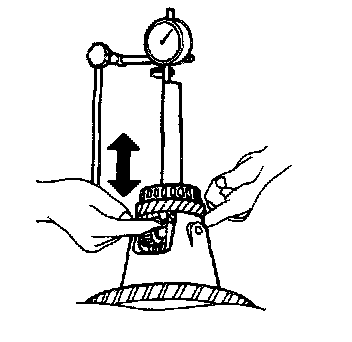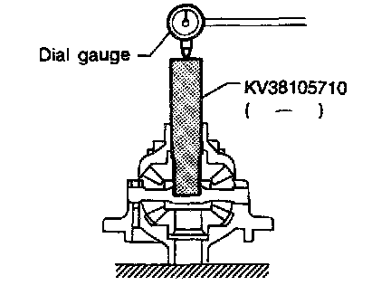 b. Move side gear up and down to measure dial indicator deflection. Always measure indicator deflection on both side gears. Clearance between side gear and differential case with washers: