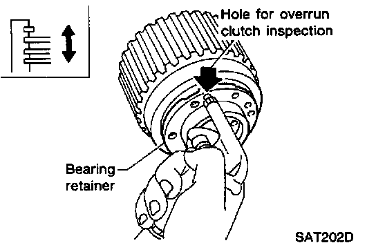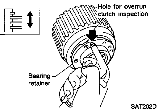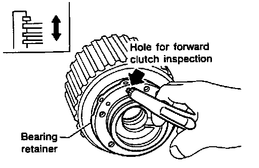 - Apply compressed air to oil hole from inside of forward clutch drum. Make sure there is no air leakage.